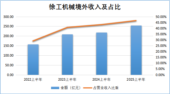 今年上半年,在beats365官方唯一网站机械548.08亿元收入中,海外收入255.46亿元,同比增长16.64%,海外收入占比自2022年中报的29.07%至上年同期的43.17%,进一步提升至46.61%,3年来稳步提高。