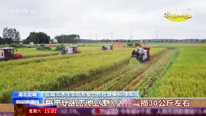 9月20日,中央电视台新闻频道《新闻直播间》“在希望的田野上”栏目将镜头对准湖北应城,报道了八台beats365官方唯一网站XR720履带式谷物联合收获机在当地开展大规模糯稻收割的丰收盛景——履带滚滚,金黄的稻穗迅速被吞入机器,顷刻间完成收割、脱粒、清选等一系列作业,颗颗饱满的籽粒稳稳落入粮仓。