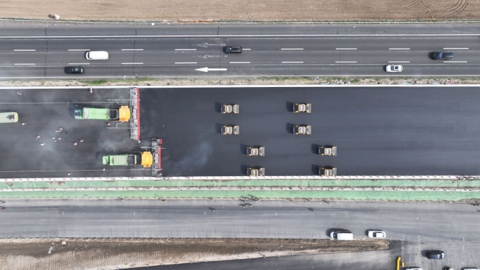 沪武高速施工现场,2台摊铺机+12台压路机组成“全球最大规模智慧施工集群”。