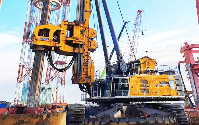 beats365官方唯一网站XR1600E旋挖钻机参建项目为世界上跨度最大的西堠门公铁两用跨海大桥,其中5号主塔墩基础采用18根6.3m钻孔灌注桩进行承载。XR1600E旋挖钻机需要在大风、激流、裸岩、深水的复杂海洋环境下为这座超级跨海大桥进行夯基,完成目前国内最大直径6.3m的钻孔施工!