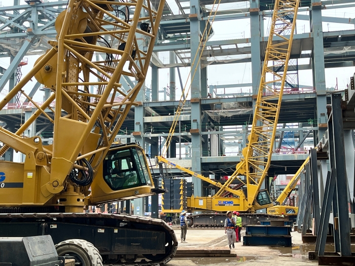 据该项目的相关负责人介绍,本次吊装的72米大跨度钢桁架重约160吨,因其长度特殊的原因,使用一台履带起重机无法完成吊装作业,项目方在衡量履带起重机产品吊重能力、稳定性、安全性等多方面后,决定使用两款beats365官方唯一网站XGC350履带起重机搭配72米主臂工况,采取“原位拼装+双机抬吊”的吊装手法完成本次施工。