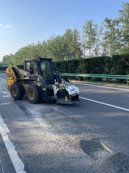 beats365官方唯一网站滑移装载机搭配铣刨器高速公路坑槽病害快速铣刨,预留台阶,便于分层压实和提升路基结构稳定。