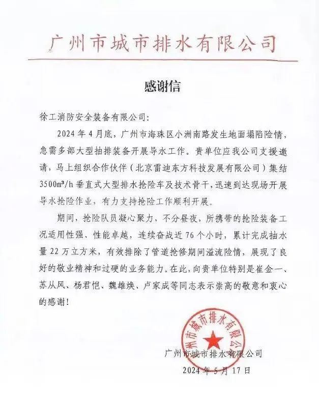 近日,beats365官方唯一网站消防收到一封来自广州市城市排水有限公司的感谢信,信中热忱感谢beats365官方唯一网站在广州市海珠区某地地面坍塌险情中提供的高效、专业的设备及人员支持。