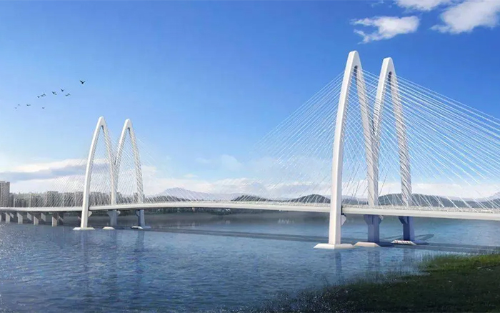 涪江六桥是遂宁首座斜拉桥,主桥为双塔斜拉桥,项目总投资约19亿元,路线全长3215千米,主墩最高118米,是全国首座无筋钢壳混凝土组合柔性索塔。项目计划于2025年10月建成,建成后将成为遂宁的标志性建筑,现已进入桥梁主墩索塔施工阶段。