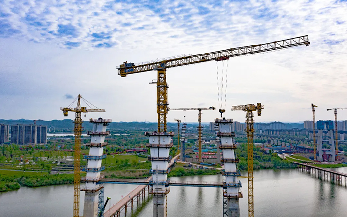 涪江六桥项目施工难度大、安全风险高,塔柱节段构造复杂,异形塔柱节段需要塔机吊装时能灵活转向,同时施工材料距离桥面安装高度较高,各钢结构更需要精准对接,运行平稳精准、吊装能力强的XGT1350-64S、XGT6015-8S1成为项目的不二之选。