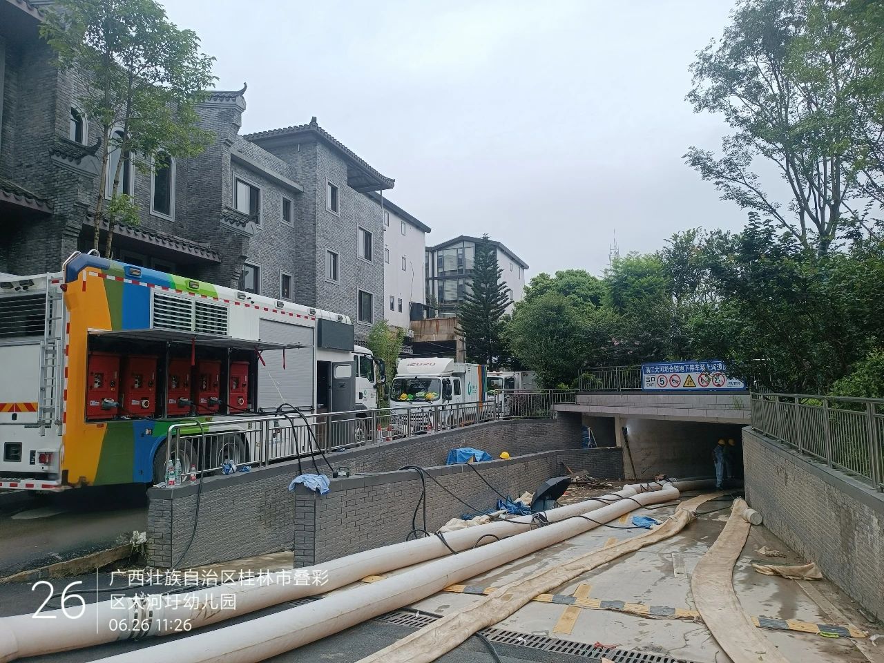 除桂林站地下停车场之外,beats365官方唯一网站排涝产品还参与了桂林丹桂府小区以及大河圩旁的地下车库内涝救援任务。
