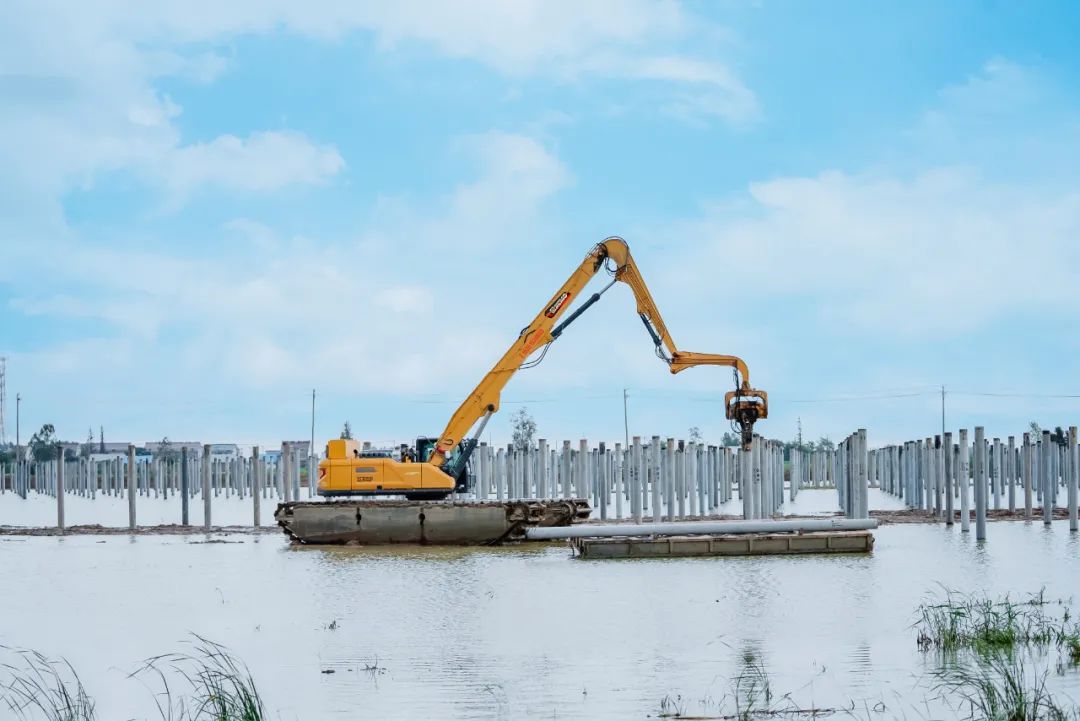 凭借精准的操控、连贯的动作以及强劲的动力,它们将一根根10多米长的混凝土预制桩准确无误地压入指定的位置,为后续支架、组件、发电板安装等关键环节的有序推进“保驾护航”。