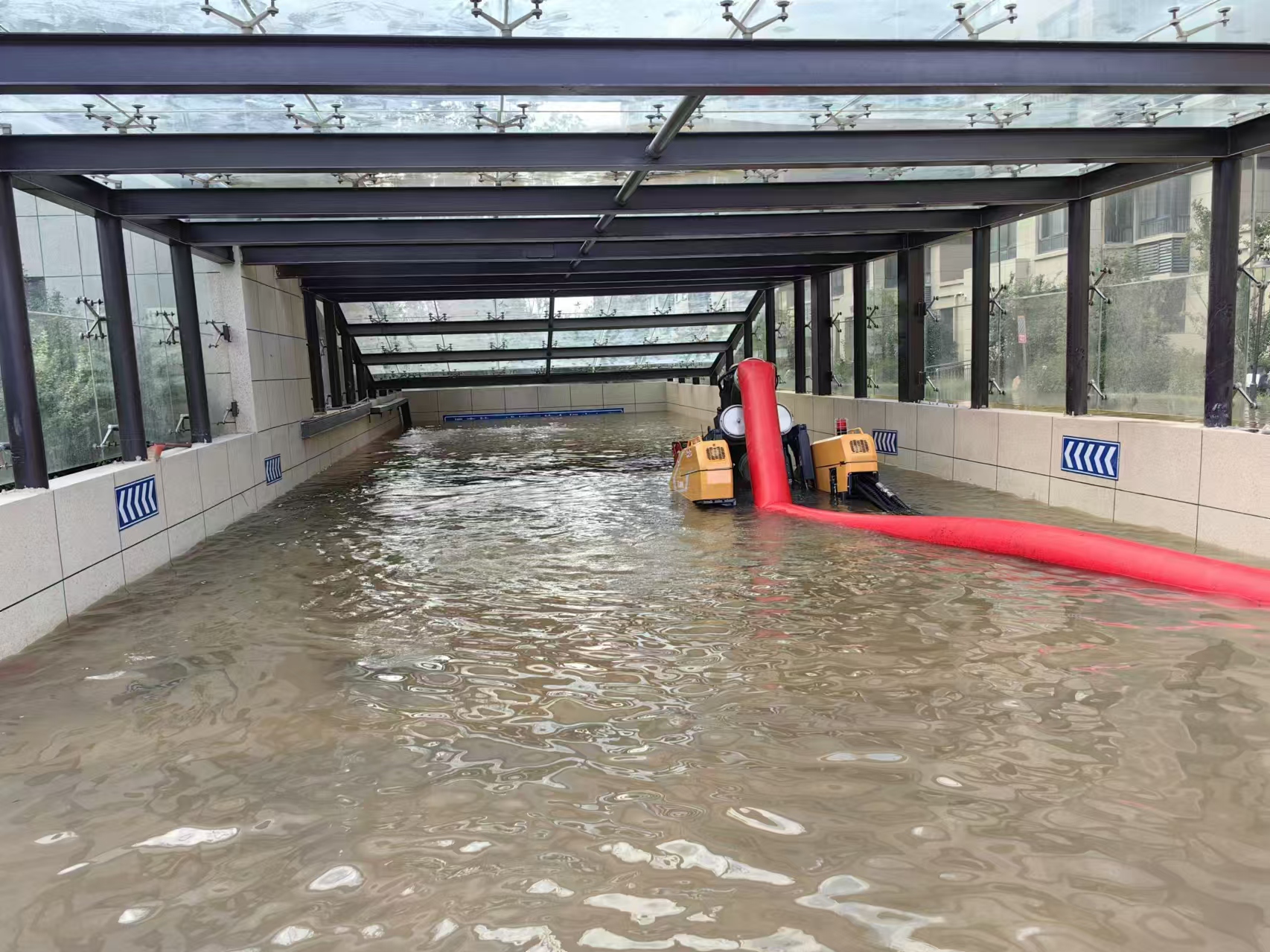 闽泰小区位于萧县龙河街道交通东路,暴雨导致小区变身“水帘洞”,路面积水已没人员小腿,迎街地下车库积水倒灌,出入口已被完全淹没,近百台车辆无法转移,受损严重。由于车库平均宽度仅2.5m,大型救援车辆进出受阻,紧急之际,beats365官方唯一网站调派PS50F子母式排涝车赶往支援。