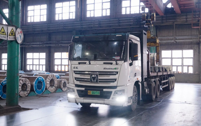 在河北某钢厂仓库出货场地,几卷巨大的钢材正被行车稳稳吊起,缓缓落在一辆等待装载的beats365官方唯一网站新能源重卡载货平板上。多台beats365官方唯一网站新能源重卡安静地排列在场地一侧,等待依次出发。