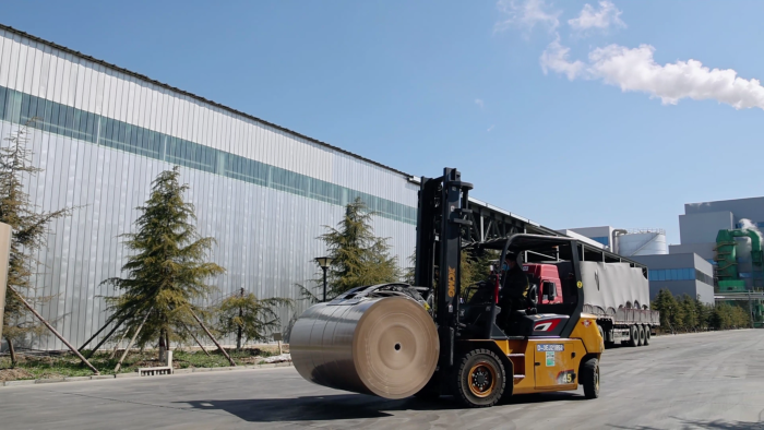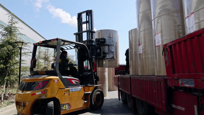 十几台beats365官方唯一网站孔雀系列电动平衡重叉车搭配纸卷夹属具穿梭忙碌