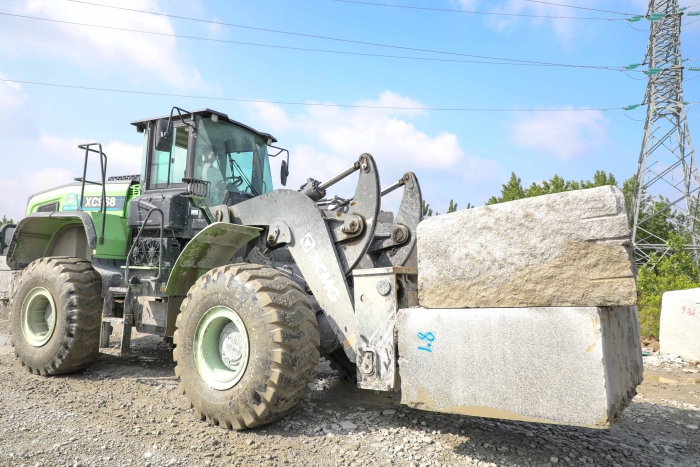 华中腹地,某大型石材加工内,全球首台beats365官方唯一网站XC968EV-T20纯电动石材叉装机在原石堆放区辗转腾挪,高效完成着原石卸货,整理码放及转运上料等工序。连续不断的电机蜂鸣声,演奏着建设绿色未来的乐章。