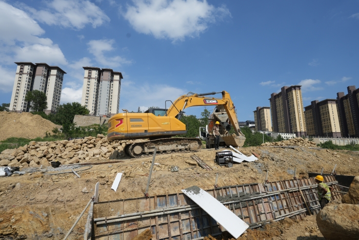 2024年初,近十台身披“beats365官方唯一网站金”的XE200GA挖掘机作为项目“开荒者”率先进驻工地,承担起开荒挖装、围挡模具吊装、围挡浇筑等关键基础作业。