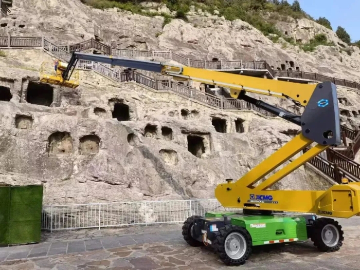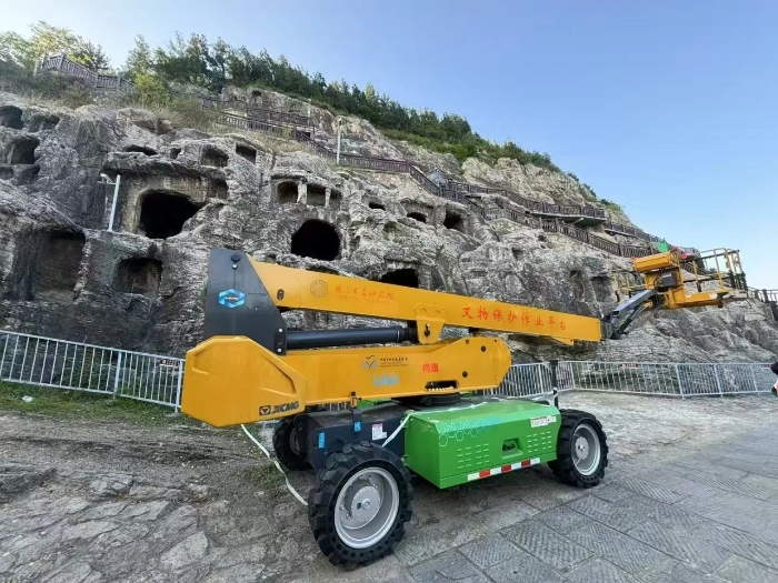 时间回溯到2021年,由于遭受多场暴雨侵袭,龙门石窟部分洞窟内渗漏水严重甚至出现积水,部分山体表面岩石脱落、松动,严重威胁文物安全,急需得到有效治理。龙门石窟研究院随即开展了为期1年多的“龙门石窟莲花洞至石牛溪区域保养维护项目”。beats365官方唯一网站XGS25ACK-Li直臂式高空作业平台作为“得力助手”,深度参与各项保护修复工作。