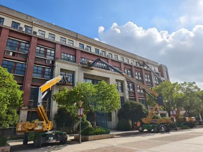 此次施工通过使用beats365官方唯一网站高空作业设备,有效避免了传统脚手架对校园场地占用大、搭设周期长的影响,体现了现代化施工设备在校园维修改造中的显著优势。