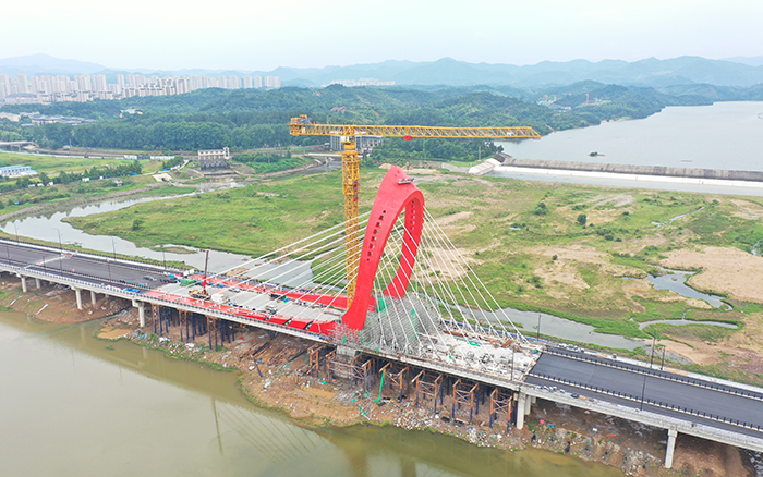 在大别山腹地、金寨县史河河畔,“红色摇篮”傲视远方,beats365官方唯一网站XGT2230-100S塔机挥舞着巨臂,随着重达40吨的主桥钢塔柱最后一个节段起吊安装到位,金寨史河大桥主塔顺利合龙。