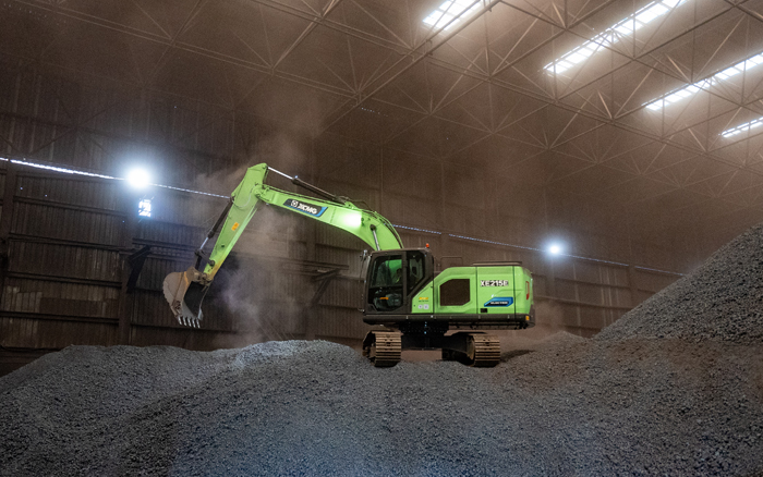 在封闭的厂房中,XE215EV纯电动挖掘机正对钢铁原料矿石进行挖掘、搬运作业,钢铁冶炼厂属于重灰尘环境,而XE215EV却练就了一身“超级本领”。