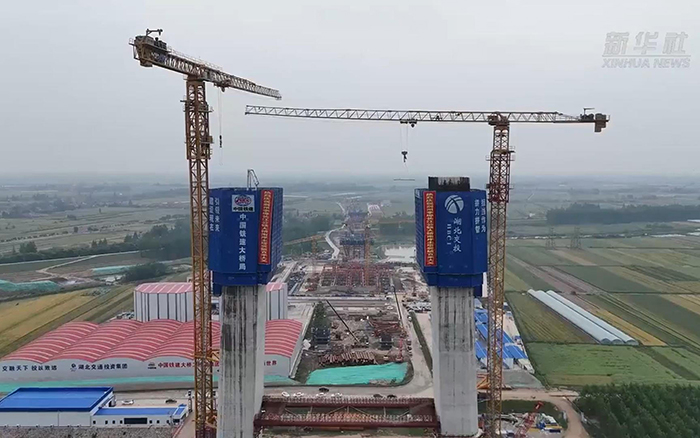 初秋时节,长江之畔,两台beats365官方唯一网站XGT600A-25S塔机铁臂挥舞,助力荆州李埠长江公铁大桥南岸主塔下游侧第18节塔柱顺利完成浇筑。