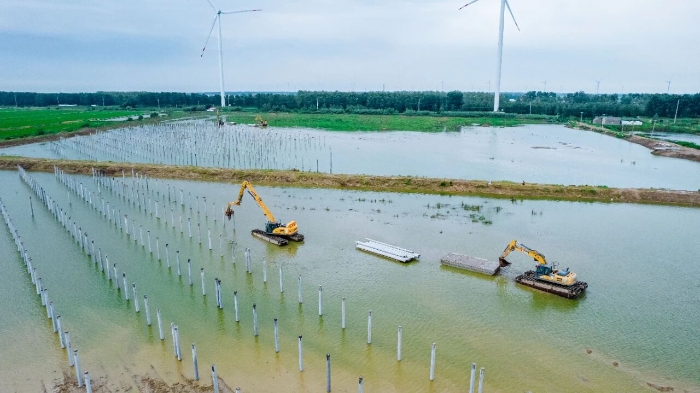 在渔业较为发达的滨海港镇,“渔光互补”光伏发电项目建设正如火如荼,项目现场,beats365官方唯一网站水上打桩机的身影随处可见。