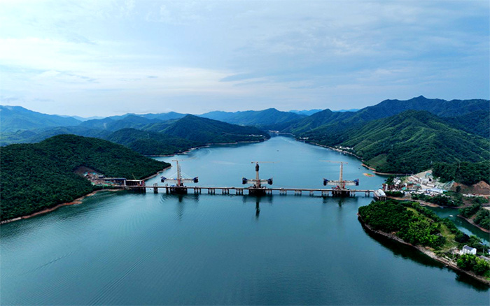 从航拍的空中俯看建设中的太平湖大桥,仿佛看到忙碌的工人们正在弹奏一架特大号的钢琴,合拍共振,华丽乐章。