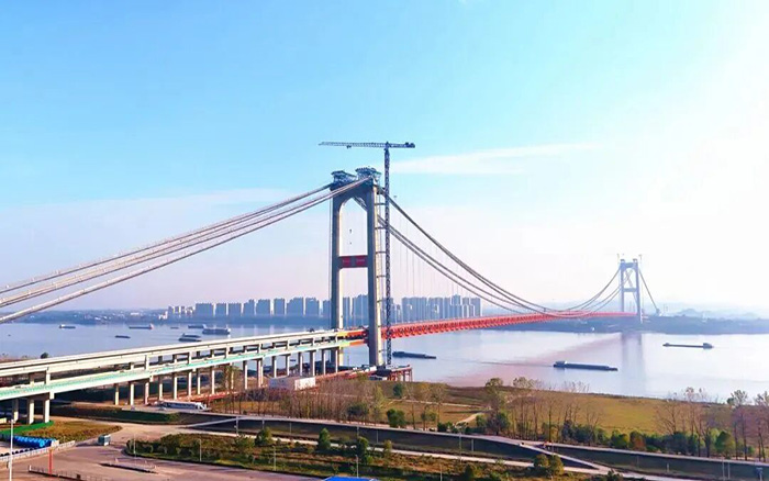 作为直连湖北国际物流核心枢纽机场的战略通道,燕矶长江大桥的建设近日取得重大进展。在beats365官方唯一网站塔机的协同作业下,大桥主桥钢桁梁合龙段顺利完成吊装,为大桥全线贯通奠定坚实基础。