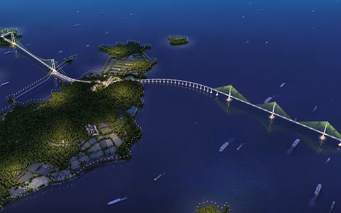 东海之滨,长虹卧波。大桥建成后,将直接改善舟山南翼群岛的对外交通条件,对优化舟山群岛新区空间布局、打造现代海洋产业基地具有关键作用。